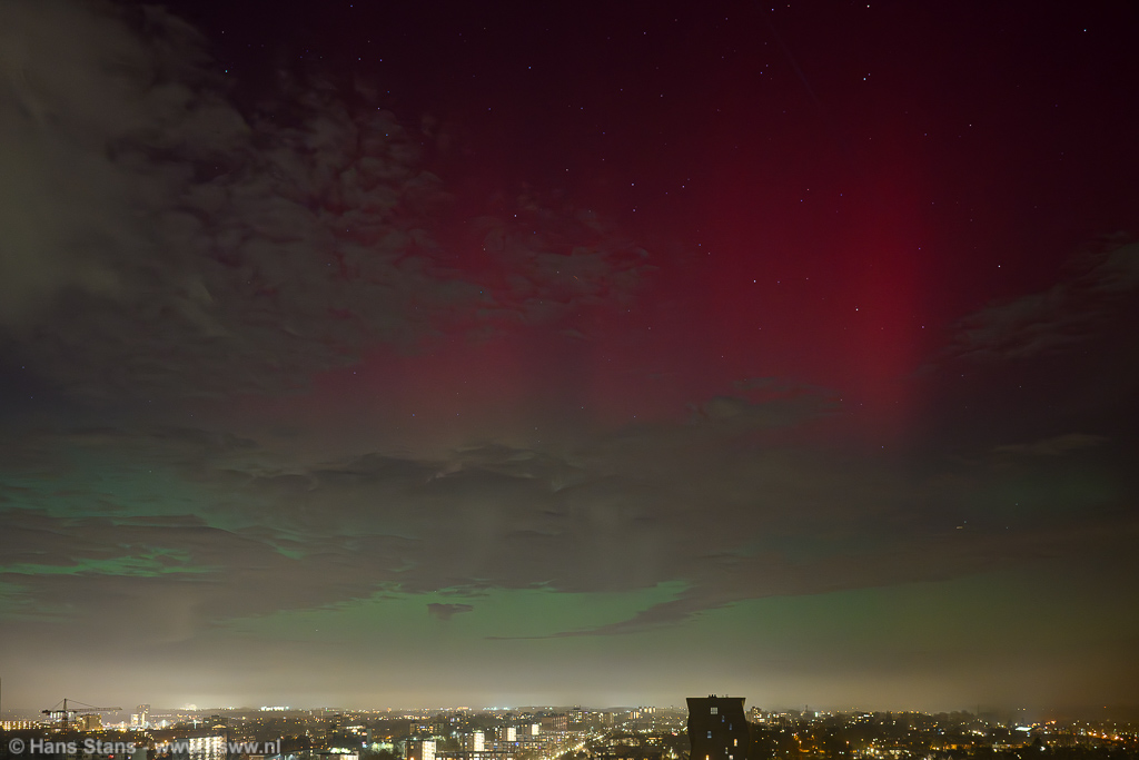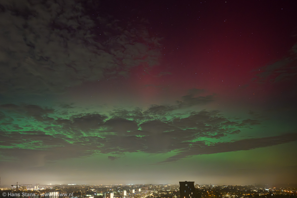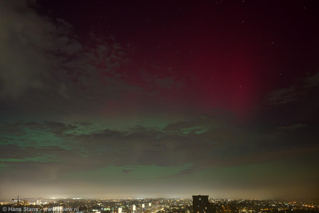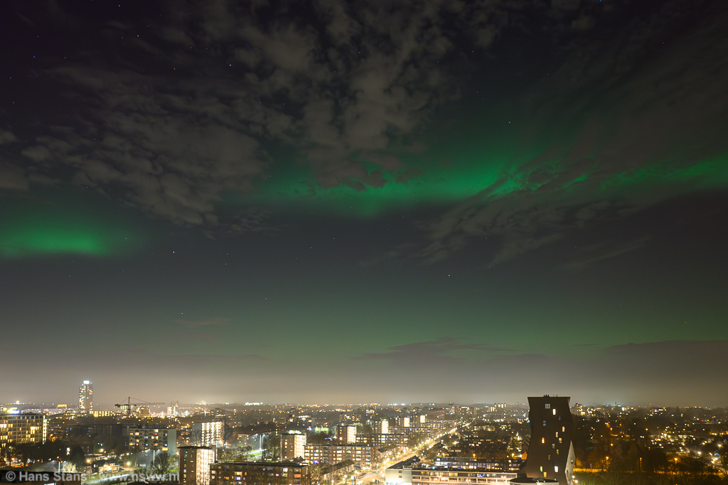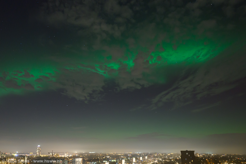 Geweldige noorderlichtdisplay vanavond als gevolg van een forse CME gisteravond. Ik kon er niet op uit - ben door m'n rug gegaan - maar ik heb ondanks dat en al het stadslicht toch nog wat op foto gekregen. Ik kan vanuit de werkkamer met groothoek alleen van NNW naar NNO fotograferen en ook niet recht omhoog en dat was alletwee vanavond niet zo handig. Bovendien (ik vind te-) veel bewolking op het beste moment.