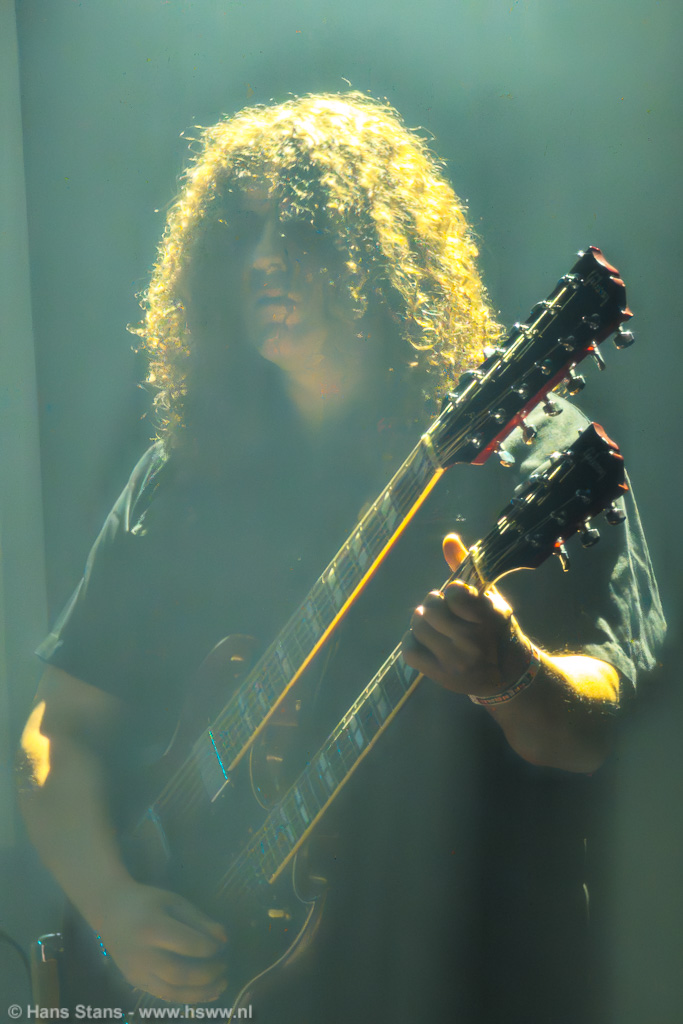 Ik kon de foto hieronder maar net en met moeite maken tussen al het publiek door - ik vond het een mooi en apart beeld, gitarist Daniel Verberk staat met de double neck precies onder een schijnwerper en de gitaar steekt er net buiten uit: