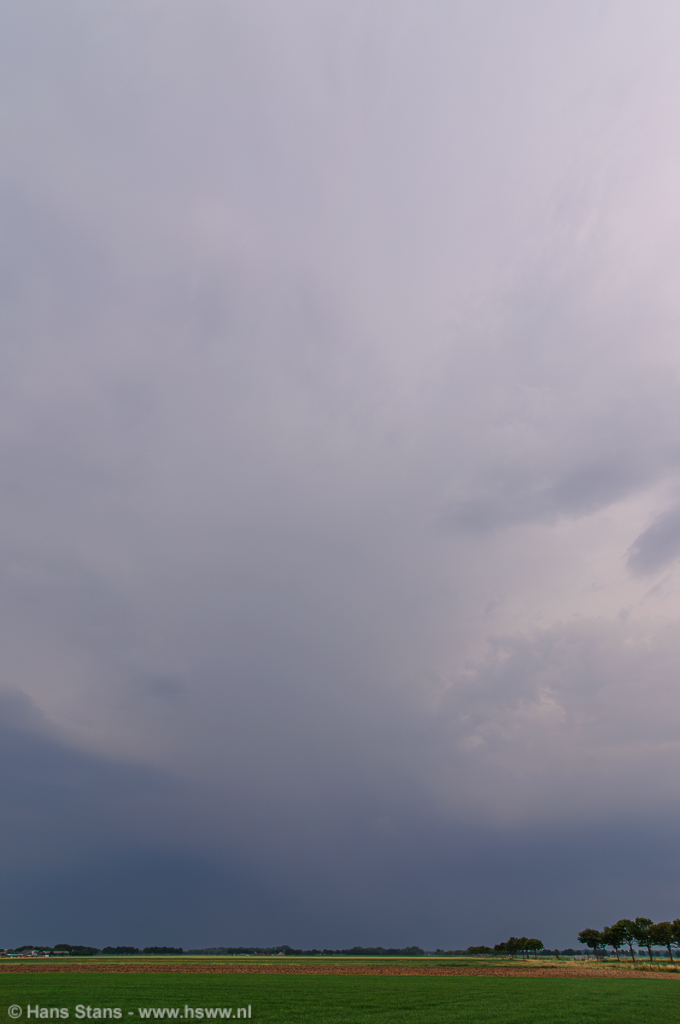 21:17 Hierboven: deze op zich niet zo gelukte foto toch hier opgenomen. Terwijl de neerslagradar alles al als een enkele neerslagkern laat zien is dit toch duidelijk nog een vrijstaande kern - zij het maar net want we gaan met amper pauze meteen weer overlopen worden. In de categorie "een beetje eng omdat we er pal onder zaten": ik zag tijdens passage een tweetal zeer rechte grijze banen op 100 meter afstand enkele meters boven het maaiveld staan - inflow stromen? Van wat!? Let ook op de linksbovenhoek van de foto, het donkere gedeelte roteerde duidelijk waarneembaar. Of het een (gedeelte van een) wallcloud was kan ik niet zeggen, ik probeerde foto's te maken maar de volgende neerslag begon en alleen al het even openen van een zijraampje leverde echt meteen liters water op leek het wel...