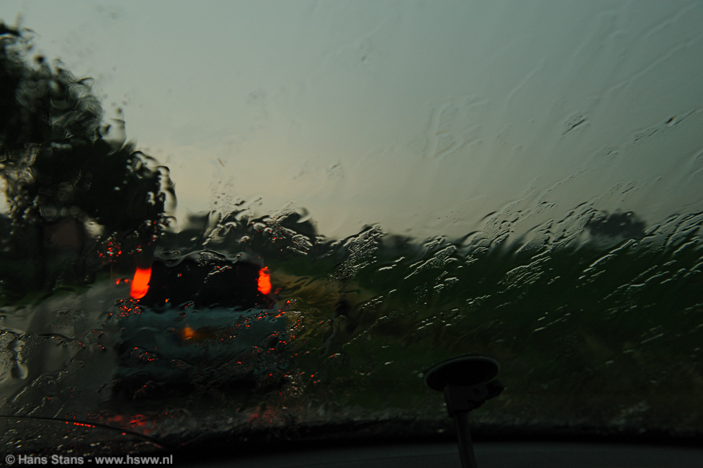 En toen waren we op weg voor wat twee neerslagzones leken met sterk verminderd zicht, veel ontladingen en opnieuw zware windstoten. Het was ontzettend donker en het zicht echt slecht, vandaar de "kwaliteit" van de video. En dan heb ik nog het eerste stuk met het slechtste zicht gemist, door mijn eerdere fotopogingen met geopend raam was er veel water binnengekomen en dus condens-vorming... Dat moest eerst weer weg. Let in het clipje ook op de auto in de verte die echt veel tijd nodig had om een paar honderd meter af te leggen. Heel begrijpelijk overigens in deze omstandigheden.
