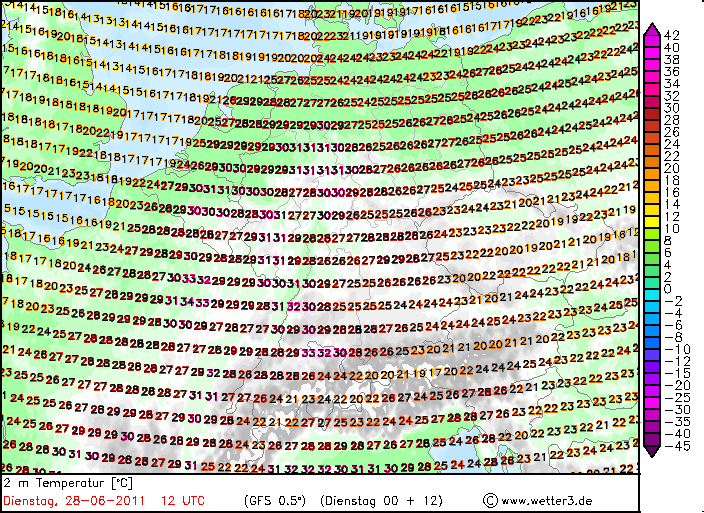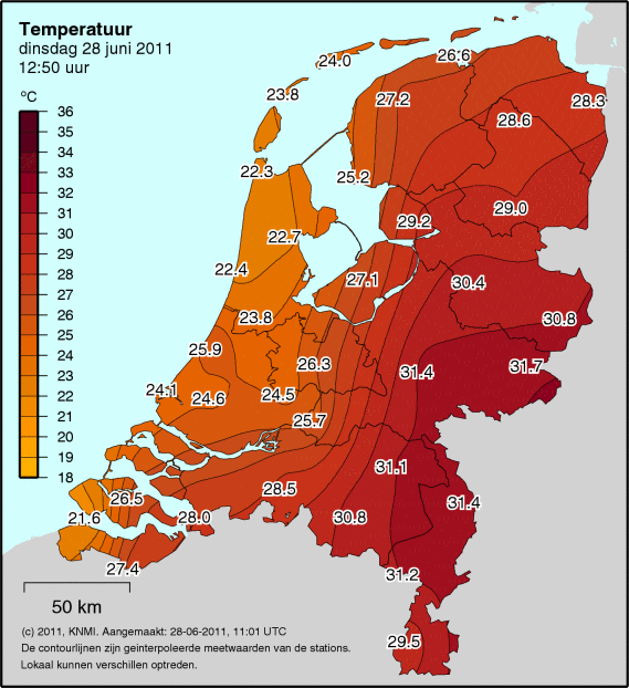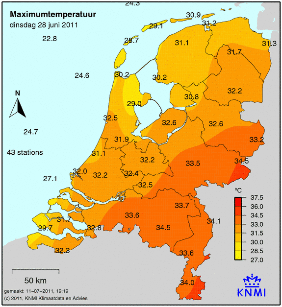 Dinsdag maxima op veel plaatsen tussen de 30 en 35 graden. Maximum hangt vooral in het westen nogal af van de timing van de buiigheid. Aan de westflank van het thermisch laag stroomt koelere lucht in de grenslaag binnen. Tmin van 16 gr aan de westkust tot 20 in het oosten. Woensdag ongeveer 19 graden.