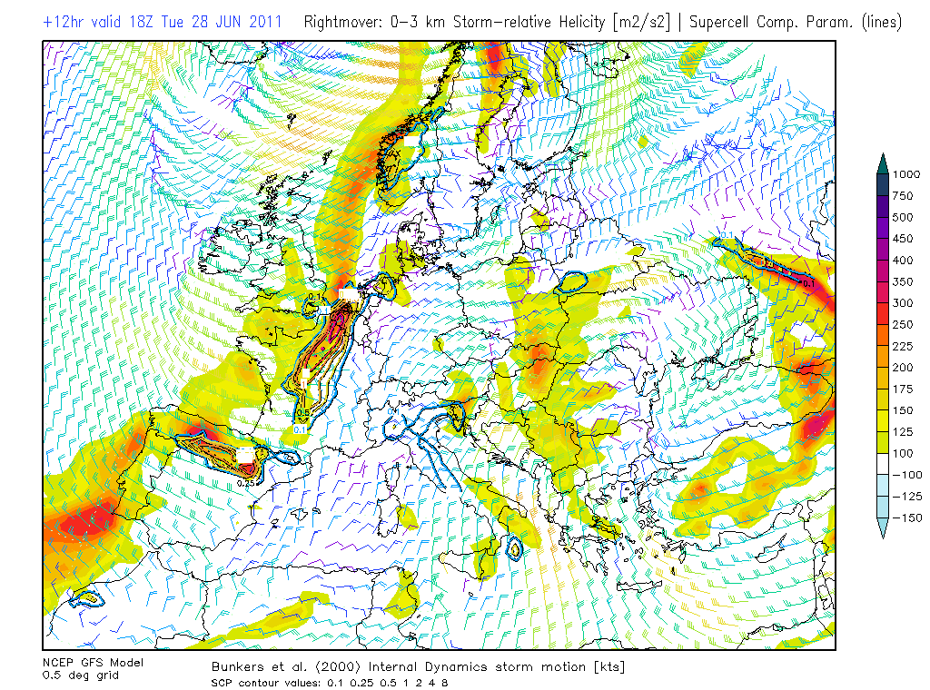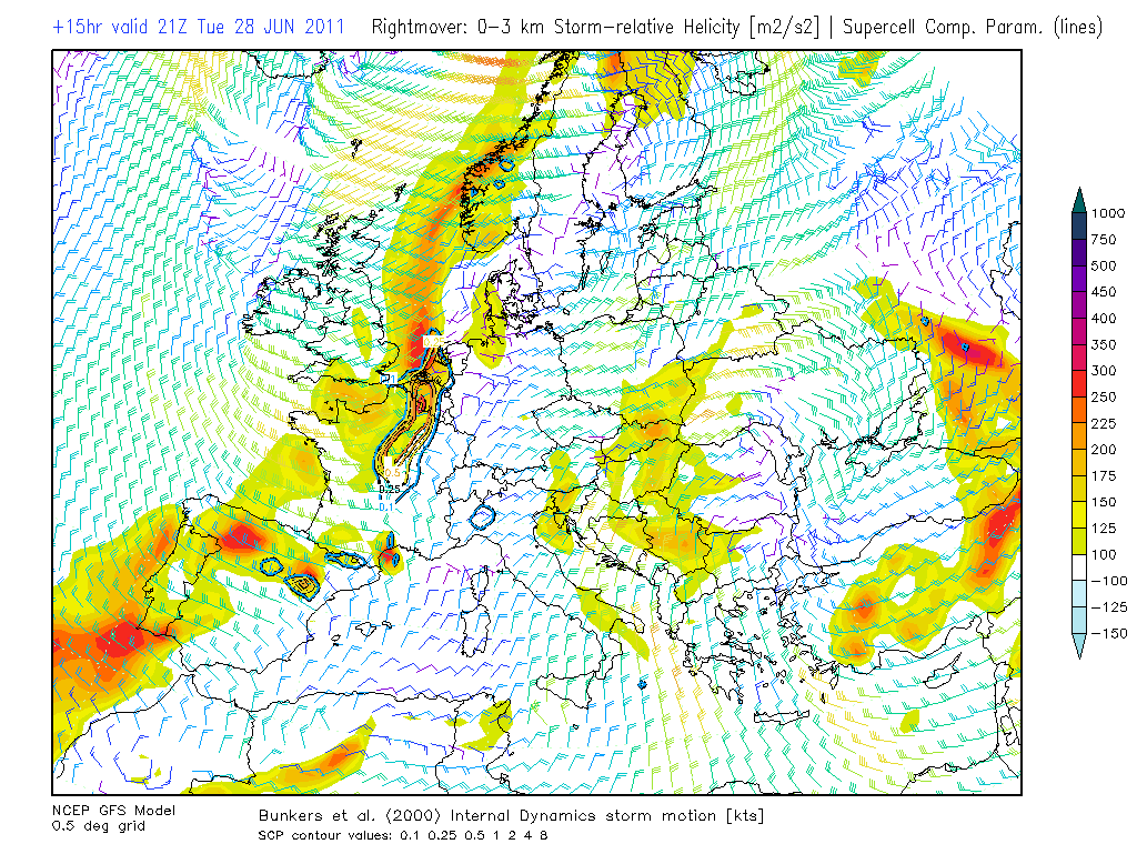 Op basis van GFS 00z berekende de LightningWizard deze kaartjes SRH en SCP. Aangezien volgens diverse experts het windprofiel juist het clusteren van buien zal bevorderen houd ik het er maar op dat gelet moet worden op vorming van nieuwe buien, al dan niet voor eventueel reeds aanwezige clusters uit - die zouden het meest interessant en hopelijk ook fotogeniek zijn. Clusters verworden met de voorziene instabiliteit en hoeveelheden vocht al gauw tot grote grijze neerslagmonsters.