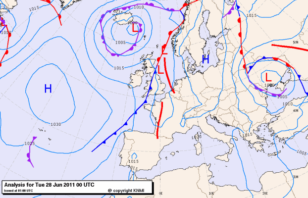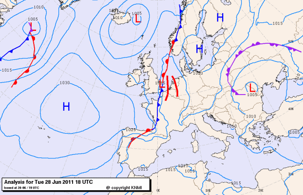 Tussen een hogedrukgebied boven de Oostzee en een langgerekte vore boven de Britse Eilanden richting het Iberisch Schiereiland bevindt zich boven onze omgeving een zuidelijke stroming waarmee zeer warme lucht wordt aangevoerd. Een thermisch laag wordt dinsdagochtend boven het westen van België verwacht en trekt dinsdagavond over het noordwesten van ons land noordoostwaarts. Aan de westzijde van het thermisch laag stroomt in de grenslaag koude lucht het land binnen. Verder is er ook nog sprake van een koufront. Het is ongeveer te koppelen aan theta-w 850 hPa 15 C. Het passeert in de nacht naar woensdag van het westen uit het land en verlaat in de ochtend het oosten. Een hoogtetrog boven de Oceaan loopt vlak achter de frontale zone mee naar het oosten en ligt donderdag 00 UTC van Schotland naar het Nauw van Calais.
