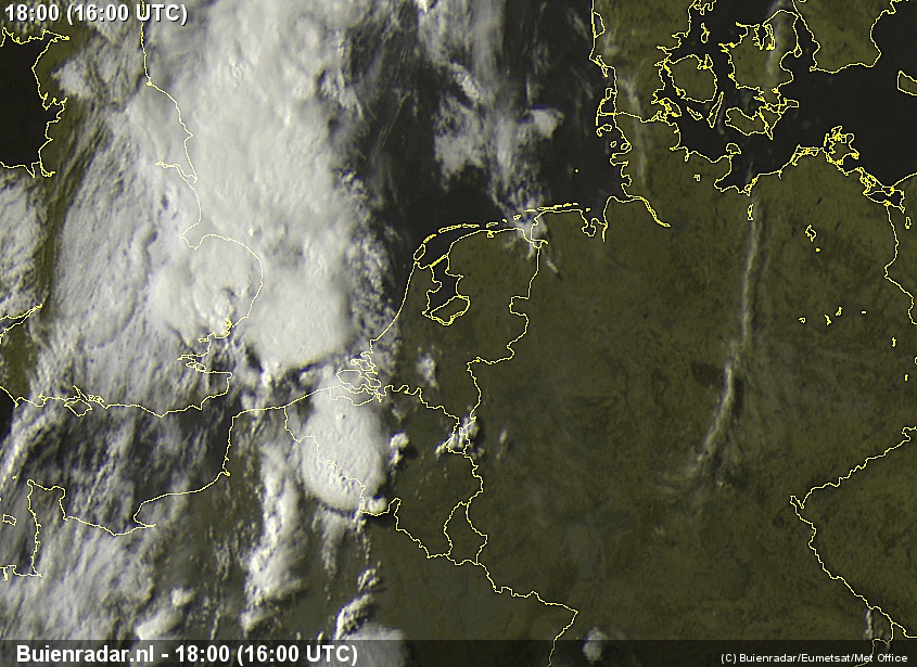 Uiteraard blijven we de ontwikkelingen nauwgezet volgen. Op de Buienradar-beelden zien we de inmiddels gevormde lijn met daarbij vooral aan de zuidkant enkele grote en zware neerslagkernen. Als die het al zouden volhouden tot onze locatie dan nog is dat bij mij niet favoriet, de kans is te groot dat het dan een grote grijze massa is geworden. Op het satellietbeeld eronder van 18:00lt zien we gelukkig dat mijn hoop op (nog) vrijstaande nieuwvorming gerechtvaardigd lijkt!