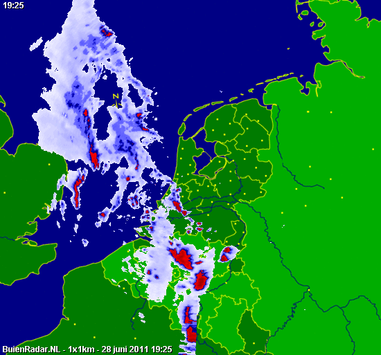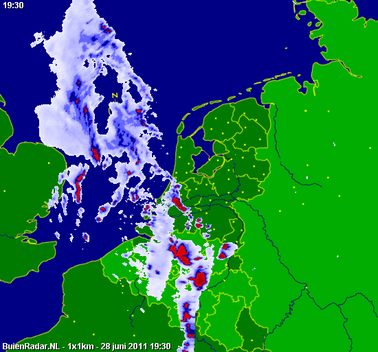 Als zo'n Grote Onweersdag aanbreekt ben ik altijd al meteen onrustig en houd ik alle weersontwikkelingen nauwlettend in de gaten. Ik had al de middag vrij genomen om klaar te zijn voor een chase, maar al vroeg bleek dat onverwacht onweersbuien die de avond ervoor al waren ontstaan zodanig konden profiteren van onstabiliteit op enige hoogte dat ze niet alleen nog bestonden, maar zelfs nog behoorlijk actief waren! Ook liepen ze iets oostelijker zodat ze over ZW-NL en zelfs bijna midden-België trokken. Op het internet verschenen vrijwel meteen al foto's uit die streken met soms echt spectaculaire wolkenbeelden.