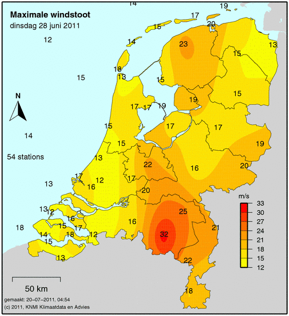 Hirlam Uitvoer wordt aangehouden, maar er zijn wel onzekerheden betreffende de koers en timing van het laag, wat uiteraard grote gevolgen kan hebben voor met name de windrichting. Verder uiteraard ook aandacht voor de windstoten die eventueel gaan optreden bij de buien. De hoogtewinden gaan niet verder dan 20-30 kn dus van impulstransport hoeven we niet veel te verwachten. Een ander effect dat een rol speelt bij het ontstaan van windstoten is de downdraft. Deze kan wel een flinke bijdrage leveren. Wanneer zo'n methode wordt toegepast op de progtemps halen we ongeveer 55 knopen. Ivens methode komt met 45 knopen. Deze wordt voorlopig aangehouden als de maat voor de windstoten zoals die in zijn algemeenheid kunnen optreden. In het achterhoofd houden we dan de 55 knopen als waarde zich zeer lokaal kan voordoen.