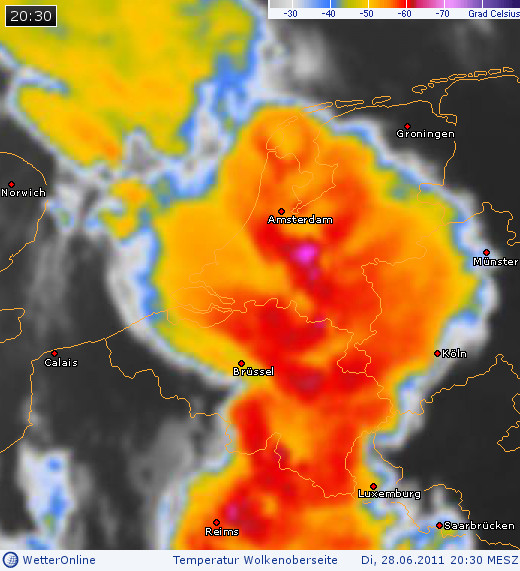 Hierboven: bijna ongelooflijk, temperatuur wolkentoppen rond -70°C! Trekken we een lijn vanuit het hart van die vlek in zuidelijk richting dan blijkt dat we precies onder de trek van de alleractiefste buien van die dag hebben gestaan. De buien die we rond 19:15 bij Eindhoven zagen ontstaan en besloten te volgen produceerden op het KNMI meetpunt aldaar een max windstoot van 113 km/u! Ook produceerden ze enorme hoeveelheden neerslag, ruim 10km NNW van onze zichtlocatie ontving KNMI station Herwijnen 79mm in 1 uur! En dat was v.w.b. de KNMI metingen een recordwaarde, zie het artikel "Extreme neerslagsom in Herwijnen" op de KNMI site.