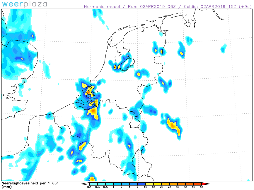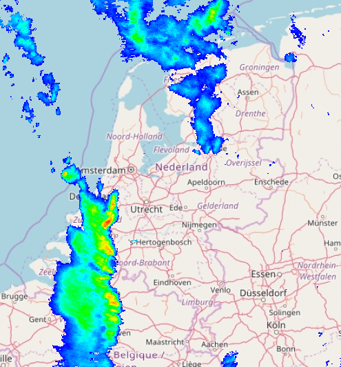 Hierboven de prognose voor neerslag van model Harmonie per de 06z run. Gezien het neerslagradarbeeld hieronder per 17:00lt zat het model het goed op, m.n. omdat de meeste activiteit op het koufront blijkt te zitten en niet zozeer op de convergentie er voor uit. Het meest actieve deel van de lijn zou overigens over midden Nederland noordoostwaarts trekken.