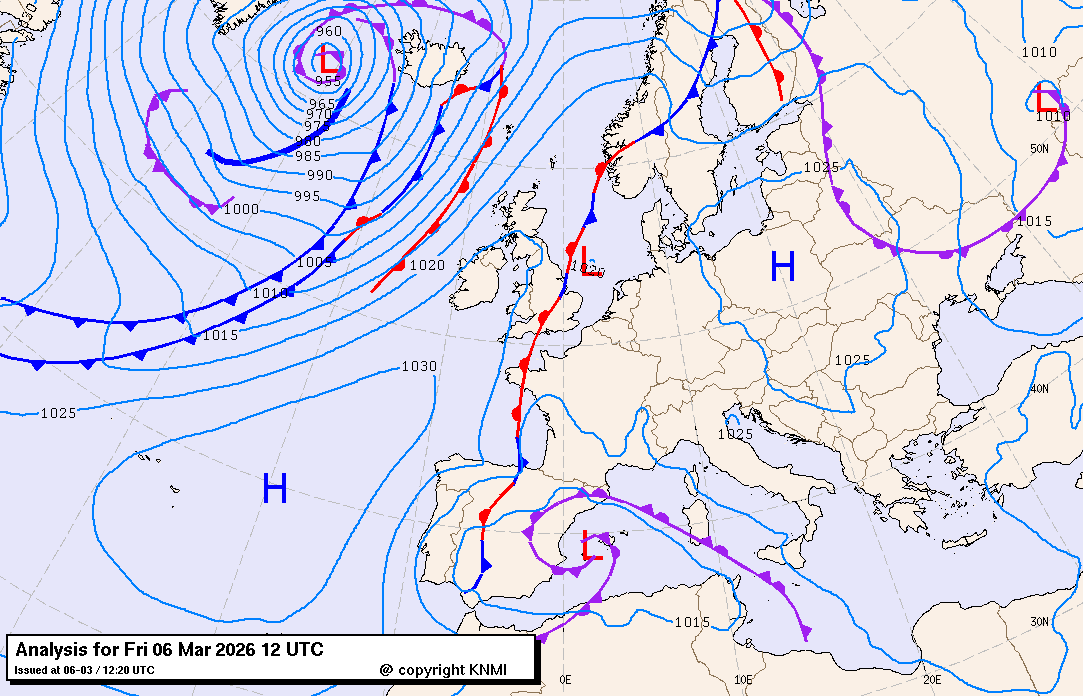 Soms wordt wel gedacht dat het om Saharazand gaat maar zandkorrels laten zich niet zo ver en op die hoogte meevoeren. Het gaat om heel fijn stof dat ontstaat als aldaar door wind zandkorrels in beweging komen en er door wrijving stof vrijkomt. Er is een aanhoudende luchtstroming met liefst een zo direct mogelijke aanvoerrichting nodig om het bij ons te laten komen. De weerkaart voor 6 maart 13:00lt, bron KNMI:
