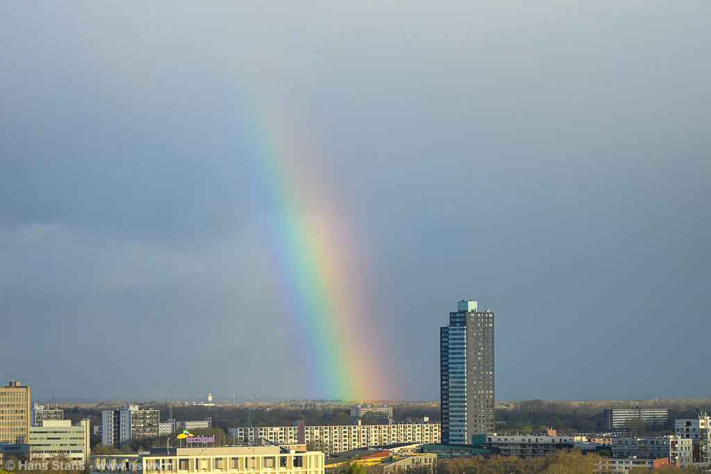 Vandaag een onstuimige dag met voormiddags veel wind en flink wat buien en buitjes (vaak kortlevend en maar kort echt actief). Hierboven: het begon 's-ochtends al goed, voordat de eerste buien arriveerden kon de opkomende zon ze nog flink aanschijnen en dat leverde alvast een lekker breed regenboog fragment op.
