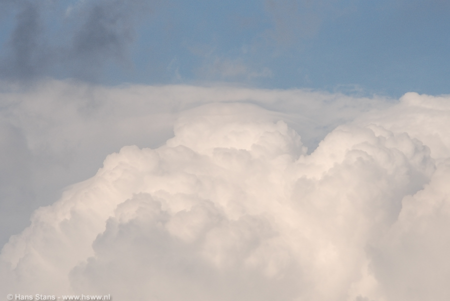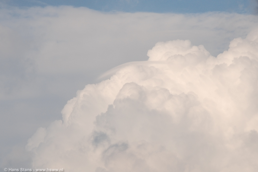 (Cumulus Congestus) Pileus: lensvomige 'deksels' of kappen op de toppen van (in dit geval) cumulus congestus. IJskristallen zijn de ingrediënten, de opstijgende kracht van de cumulus is dermate groot dat deze gevormd worden in de lucht erboven die in een hogere en koudere laag gedrukt wordt. De pileus-verschijnselen op deze pagina kwamen en gingen heel snel, de stijgende wolk breekt telkens door de gevormde pileus, bovendien leek er in de koudere laag ook nog eens flink wat wind te staan die de ijskristallen a.h.w. wegblies. Het fotograferen werd daardoor een soort snelheidsproef! Daarbij zorgde de stratus op de achtergrond nog voor de nodige contrastperikelen.