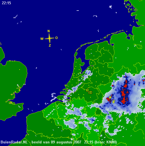 9 augustus 2007: een winderige en ronduit kille dag met een maximum temperatuur van 15.7°C. Maar het meest in het oog springend was toch wel de niet aflatende regen, de enige variatie was harde of iets minder harde regen. Op het moment van dit schrijven ligt er tot overmaat van ramp nog een fors buiencomplex net over de Duitse grens in de aanvoerrichting...