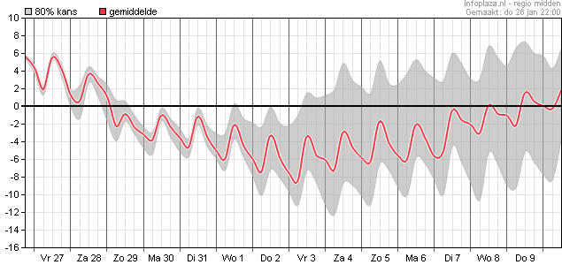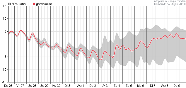 In de temperatuurpluimen zien we heel aardig de huidige overeenkomst tussen de EC (boven) en de GFS (onder) verwachtingen terug. Weliswaar is GFS over de hele linie wat minder koud, maar in de praktijk blijkt dit model vaak een of twee graden te hoog te zitten. Op het einde van de periode wel meer verschil maar dan zitten we al ver buiten de meer betrouwbare termijn van deze berekeningen.