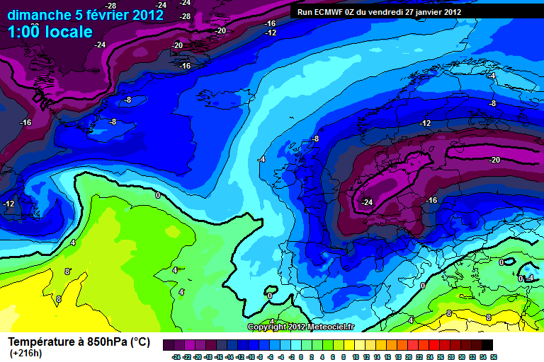 Hieronder een EC berekening van gisternacht. Getoond wordt de 850HPa temperatuur, dat is de temperatuur van de lucht op ongeveer 1500 meter hoogte. De -24°C reikt bijna tot NL, met zo'n koude lucht boven ons zou het overdag wel eens streng kunnen blijven vriezen! Overigens is het vooralsnog erg onzeker of deze luchtmassa ons wel gaat bereiken of meer zuidoostelijk trekt en dan stagneert. Maar hoe dan ook, dit kaartje toont een vrij extreme situatie!