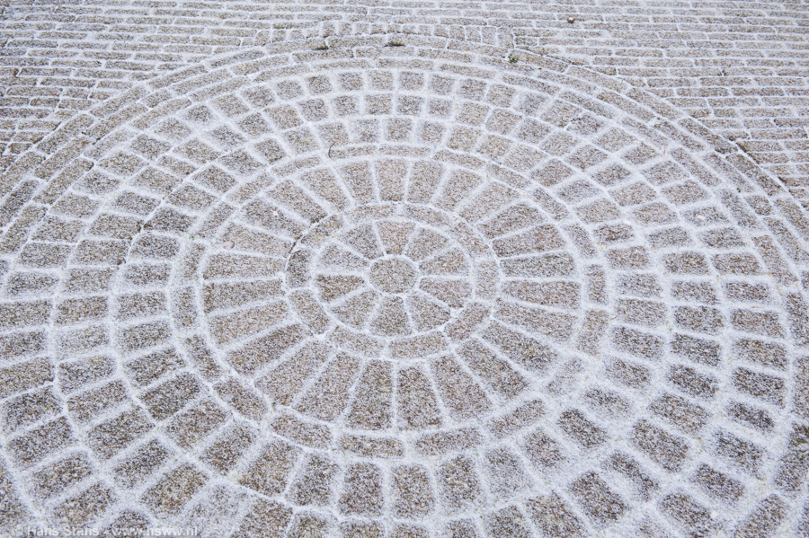 Maandagochtend 30 januari: de eerste droge sneeuw ligt er na motsneeuw 's-nachts! OK, het is wel heel weinig maar ik vond dit toch een mooi beeld, de normaal zo donkere voegen zijn nu wit! De winter is binnengevallen, maar dat klinkt meteen wel erg stoer en doet denken aan brute winterinvallen als die van eind 1978. Dit was meer een sukkelinval, de koude lucht bereikte NL rond middernacht van zaterdag op zondag en zou vervolgens vanuit het NO heel traag verder trekken: