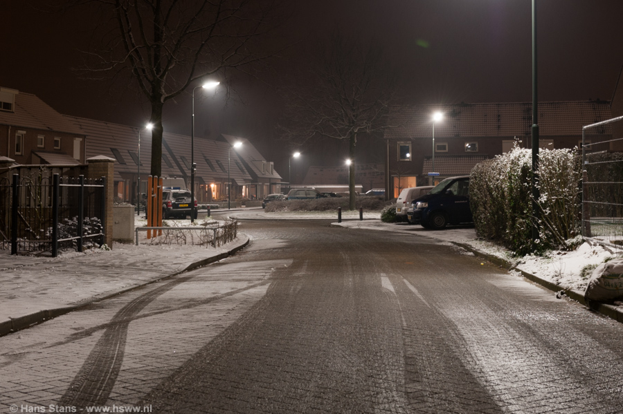 We kwamen hier tegen 08:00 in de vorst, maar het zou nog tot maandagnacht duren voordat de -1.5°C bereikt werd! Wel heeft het dan zo'n zeven uur licht gesneeuwd en dat leverde een dekje op van 1,5 tot 2 cm. De straten waren gestrooid en zat er nog wat warmte in de bodem zodat het er toch wat rommelig uitzag, zie de foto hieronder. De wat papperige en aangereden sneeuw zou hard opvriezen en dat leverde dinsdagochtend erg gladde binnenweggetjes op.