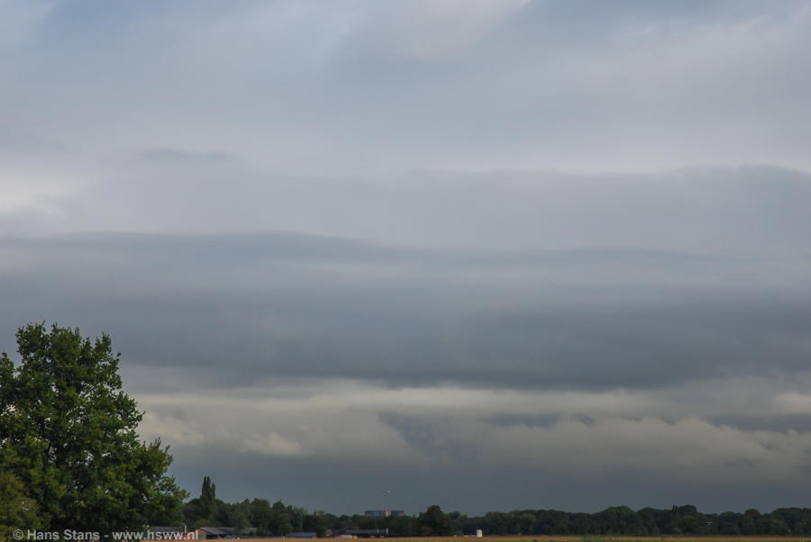 Hierboven: op zijn minst een shelf-achtige aanblik! Ik pak m'n camera in als ik een eindje naar links ineens, binnen een paar seconden, een rijtje Kelvin-Helmholtz golfjes zie ontstaan! Gauw de camera weer in de aanslag, echter de structuur houdt slechts enkele seconden stand. Jammer, het was zo dichtbij dit te kunnen fotograferen. Op de foto hieronder het restant van de golfstructuur... Hierna produceerde de bui kortdurende, maar hevige, regenval.