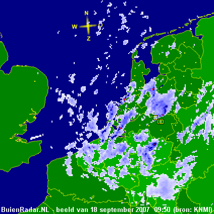 Hallo, dat ziet er steeds beter uit. Aan de noordkant is nu ook een flink neerslagscherm te zien. Ik besluit dan een kilometer richting de buienrand te rijden: