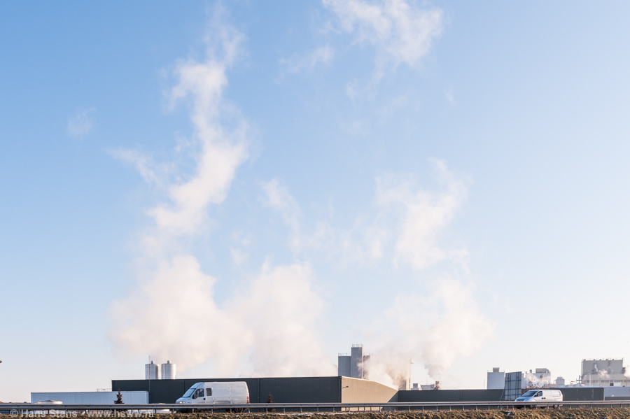 Hierboven: duidelijk drogere lucht nu weer, boven deze bedrijven hing afgelopen zaterdagochtend een enorme wolk, nu zie je het meteen oplossen.