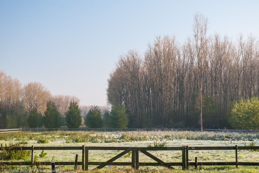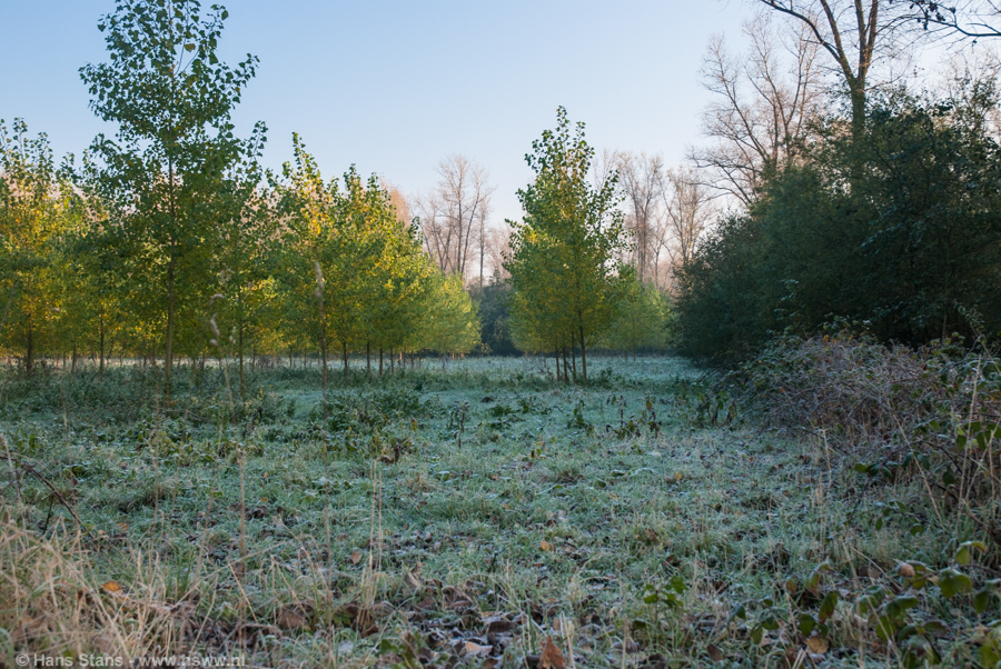 ... van dit najaar hier! Althans, de eerste 'echte' met een minimum temperatuur onder nul op 1,5 meter meethoogte. Met -1.2ºC is het natuurlijk op zich geen wereldschokkende gebeurtenis, maar gezien het toch wat vroege moment in het jaar wel een mooie kans om een foto te maken met zonlicht, heldere hemel, bomen in herfsttooi en mooi wit berijpt gras: